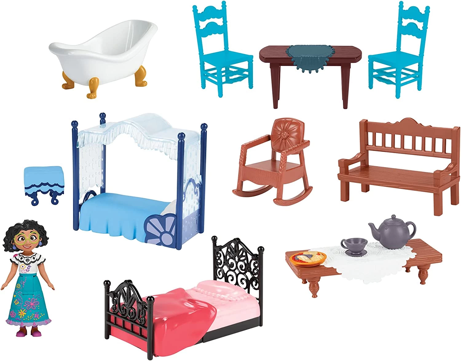 Includes: 1 Magical Casa Madrigal, 1 Mirabel Doll, 1 Staircase, 1 Food Piece, 1 Tea Cup Saucer, 1 Tea Cup, 1 Tea Pot, 1 Rocking Chair, 1 Outdoor Table, 1 Bench, 1 Dinging Table, 2 Dining Chairs, 1 Bath Tub, 1 Mirabel Bed, 1 Pepa Bed, 1 Foot Stool, 1 Label Sheet.