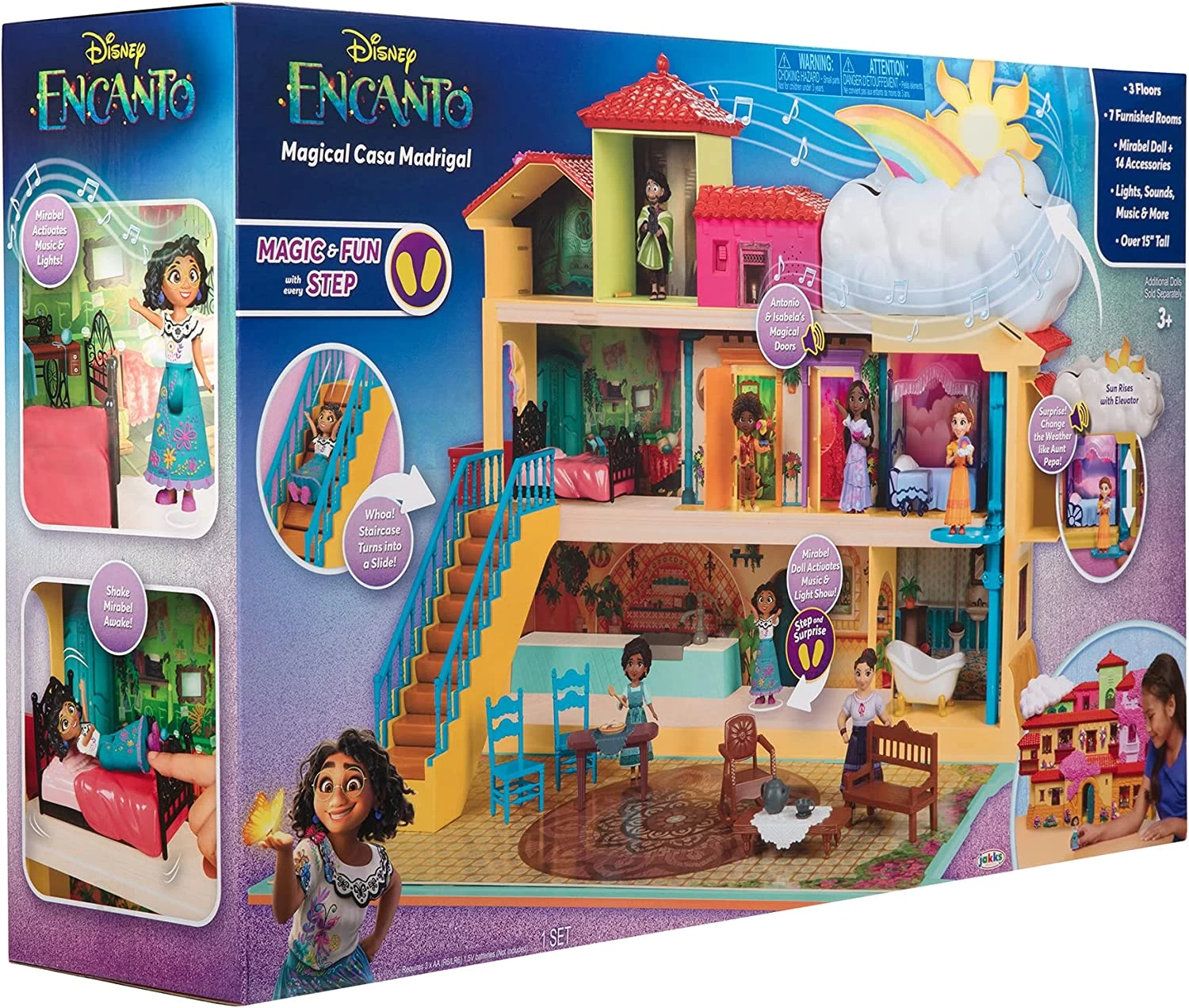 New from Disney’s Encanto, the Magical Casa Madrigal playset brings the magic of Casita to life! Playset is over 15 inches tall, with 3 floors, 7 rooms, and includes a Mirabel Doll, and 15 house accessories! Features 6 light, sound, and music features throughout the house!