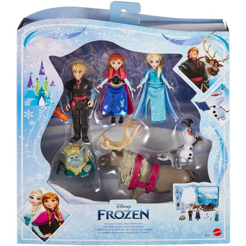 Fan-favourite movie Disney Frozen is shown with a story pack of 6 unforgettable characters, in a charming small scale! This Storybook Set includes Anna and Elsa dolls in their signature looks, Kristoff doll, Olaf figure, plus Grand Pabbie and Sven figures. The set comes in a storybook-style package with perforated play pieces that kids can pop out to expand the storytelling fun. Fans will love re-creating the story from beginning to end! Dolls cannot stand alone. Colors and decorations may vary.