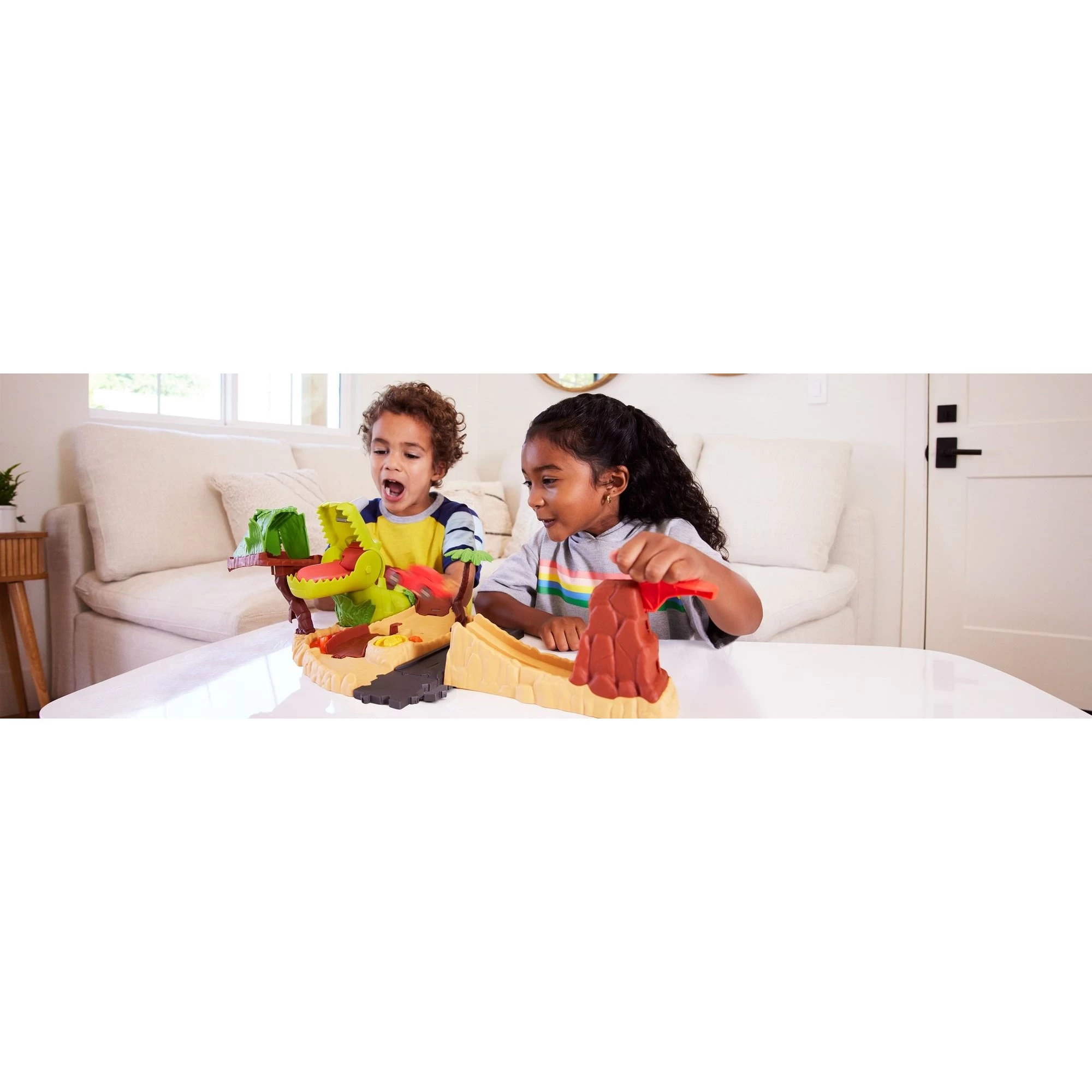 • Kids use the launcher to jump vehicles over the lava field and onto the track, but only if they can make it past the dino’s chomping jaws!