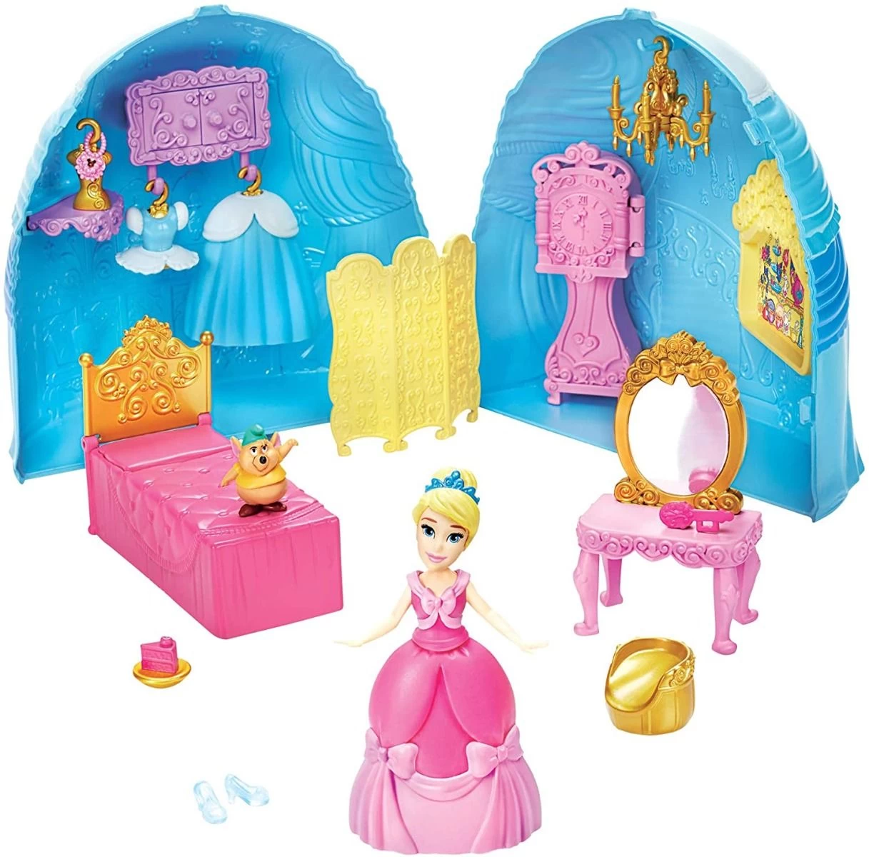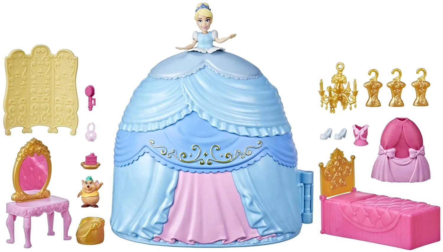 - SKIRT OPENS TO REVEAL HIDDEN ROOM: Cinderella’s ballgown opens up to a hidden world inside, with furniture, outfits, and accessories. Kids can store everything inside when they’re done playing