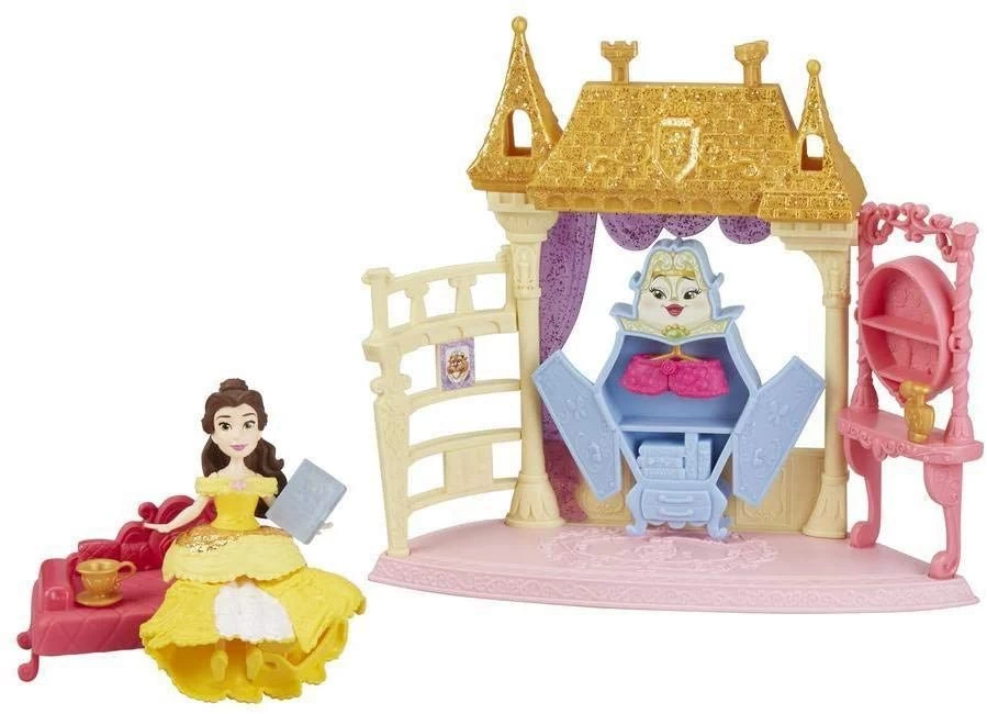 Build out the Disney Princess world with Belle and her bedroom set. Kids can pretend to play in Belle’s palace haven, her beautiful bedroom, complete with wardrobe, bookshelf, chaise lounge, and fun accessory pieces. Includes a Royal Clips skirt that clips right onto Belle in one made-for-little-hands motion.