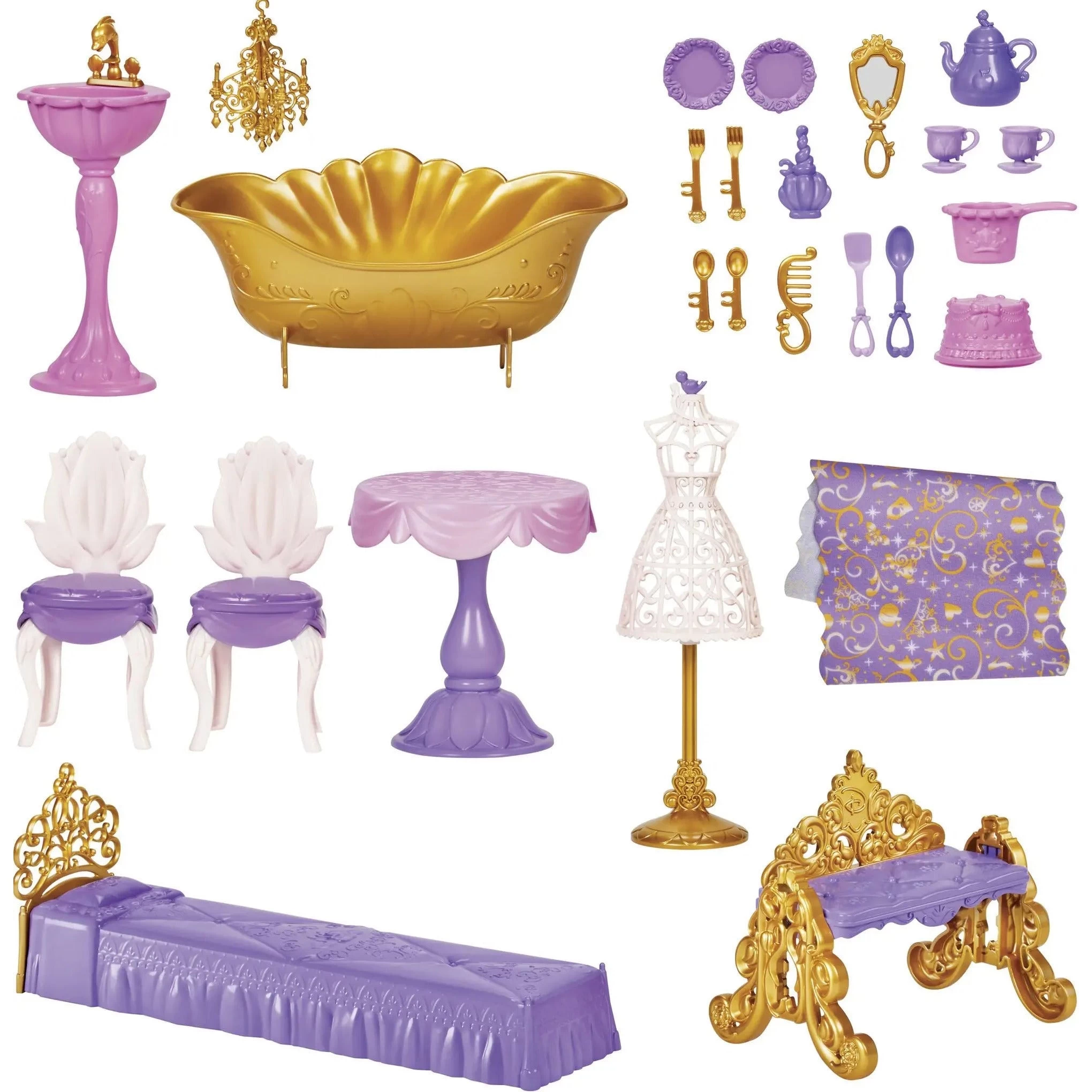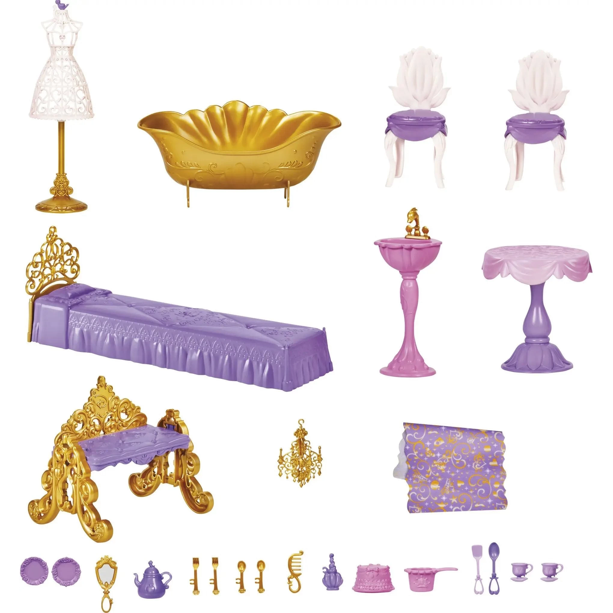 • 29 ACCESSORIES (including furniture): Castle fashion doll accessories like plates, pots and pans, spoons and forks, comb, hand mirror, and more to help kids imagine exciting adventures with the Disney Princess characters