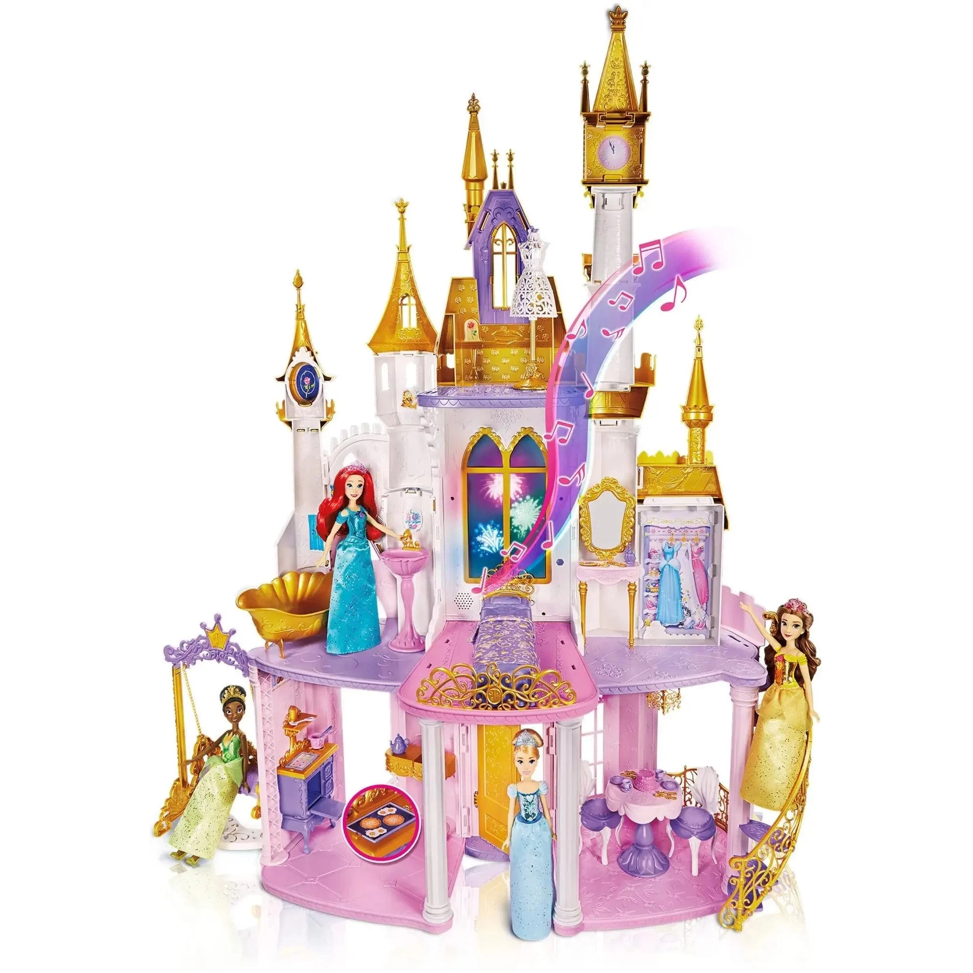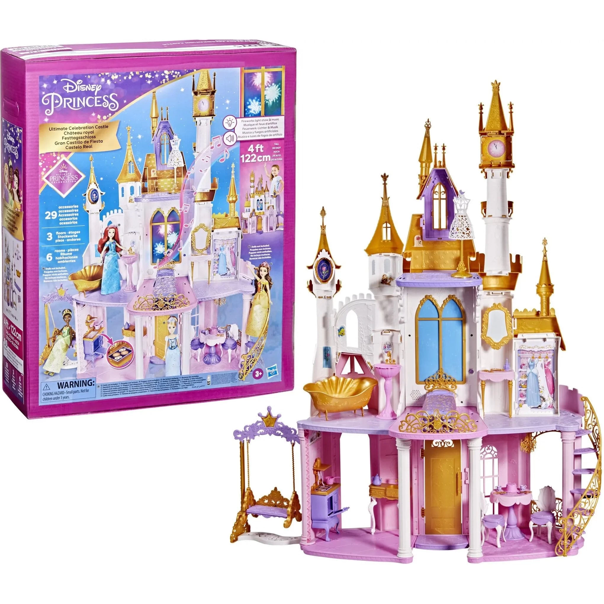 Celebrate along with the Disney Princess characters in the Ultimate Celebration Castle! Standing 4 feet tall with its classic silhouette, this dollhouse features 3 stories and 6 rooms, including a bathroom with tub and sink, bedroom with bed and vanity, a kitchen with stove, and a dining room with table and chairs. The upstairs window lights up like fireworks while music plays, so kids can imagine the Disney Princess characters watching a spectacular fireworks show. The set also includes 29 accessories, like forks, spoons, a teapot, teacups, plates, a comb, mirror, and more to help kids’ imaginations come to life. There’s a sofa that converts to a garden swing for outside of the castle. With its size, furniture, accessories, lights, and music, this Disney Princess castle dollhouse makes a great gift for girls 3 year and up. It’s a great home for Disney Princess dolls and no tools are required for adults to assemble. (Dolls not included. Sold separately. Subject to availability.)