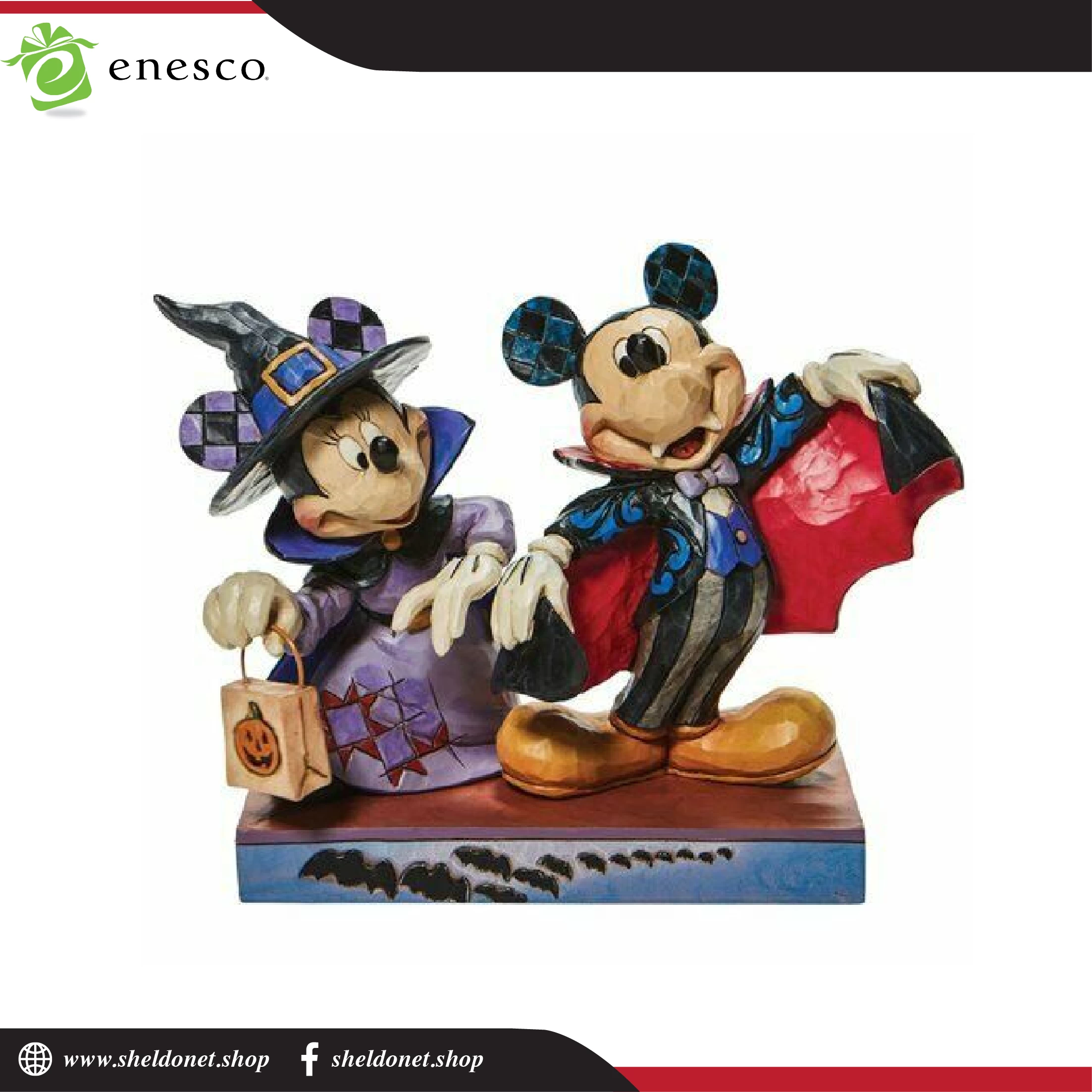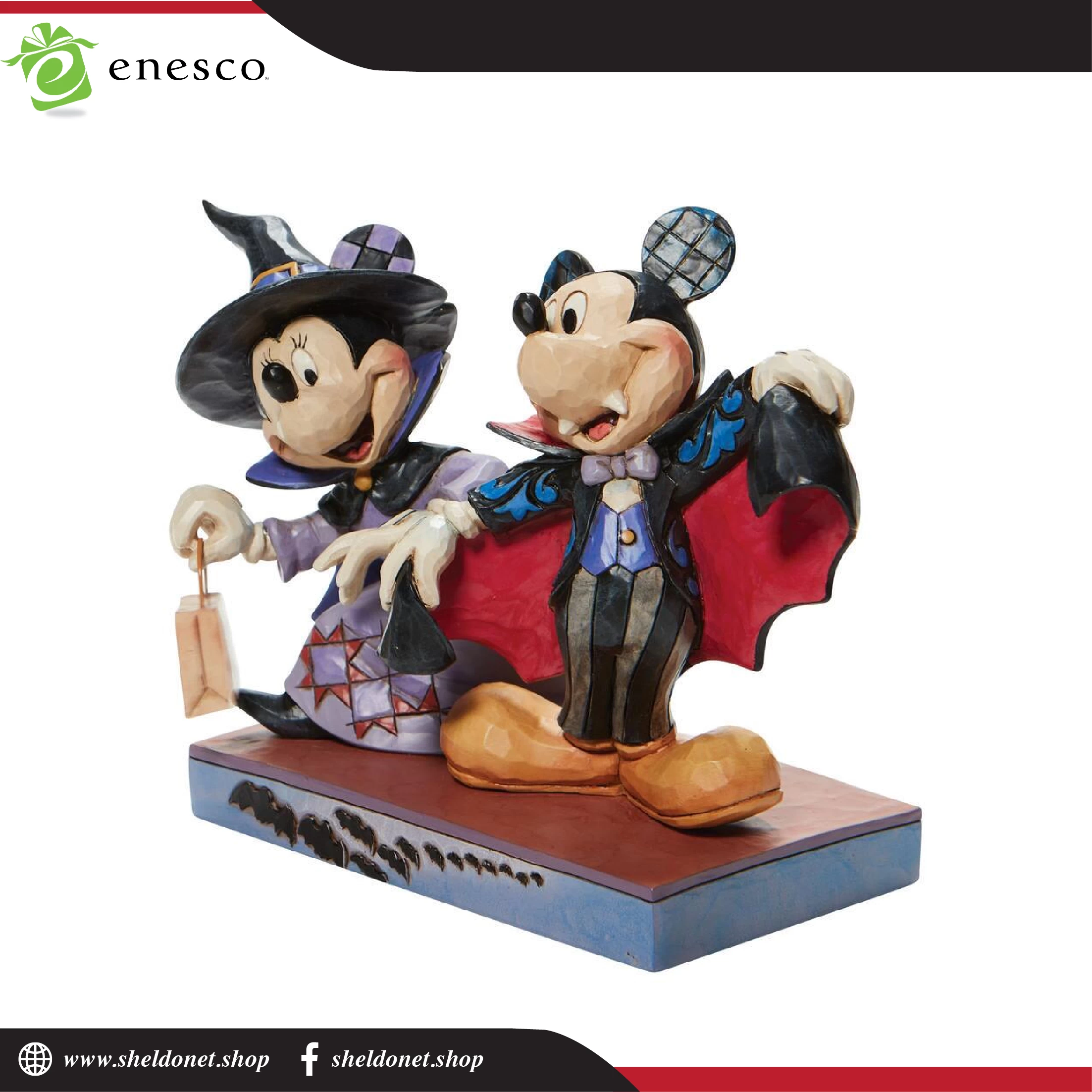 Disney’s Mickey and Minnie don some spooky suits for the sake of Halloween. Mickey dresses as a vampire while Minnie transforms into a candy craving witch in this Jim Shore design.