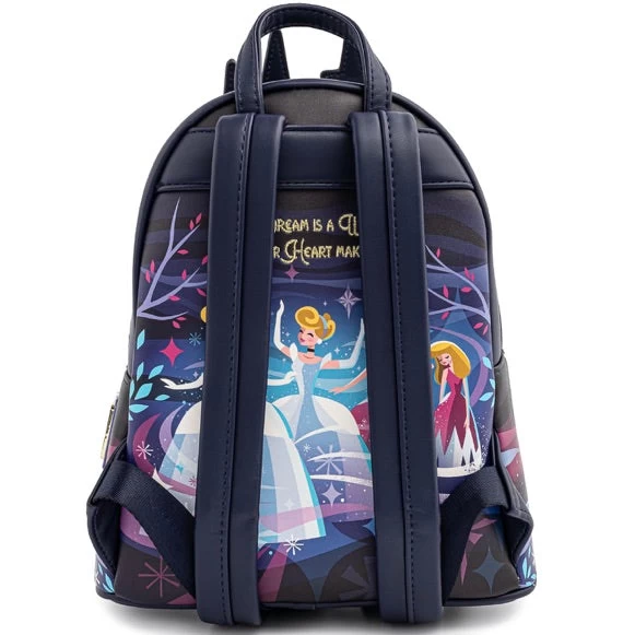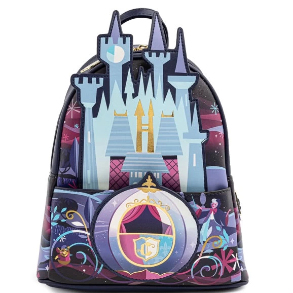 Loungefly Disney Cinderella Castle Series Mini Backpack W: 9″ X H: 10.5″ X D: 4.5″ Faux Leather Mini Backpack. Applique, Embroidered, Enamel Zipper Charm, And Printed Details. This Item Is A Backorder Expected Nov 2021