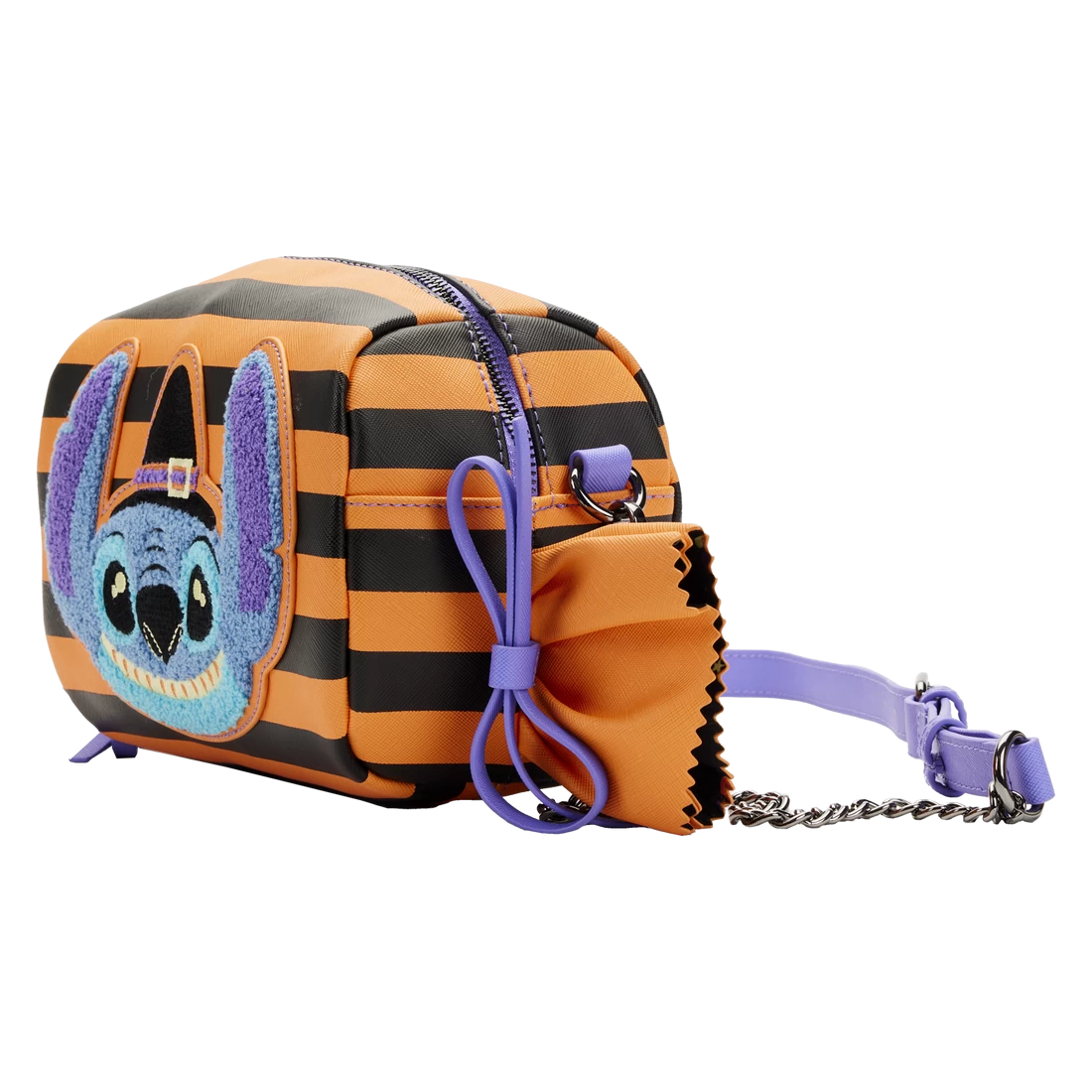 Taking the form of a tasty sweet, the front of this appetizing accessory features a chenille patch of Stitch as he wears a witchy Halloween costume. Bows of purple ribbon cinch the ends of the bag’s striped “wrapping,” and a sparkly jack-o’-lantern joins the fun as an enamel zipper charm. Turn the bag around to find a printed applique patch of Stitch saying “Gimme candy!” under a full moon. This confectionary crossbody bag will add extra flavour to any outfit and has plenty of room for storing your tricks and treats.