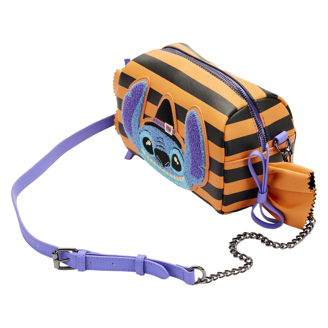 The Loungefly Lilo and StitchStriped Halloween Candy Wrapper Crossbody Bag is made of vegan leather (polyurethane). Bag has adjustable (removeable) shoulder strap and sturdy metal hardware. Additional features include applique, ribbon, chenille, and printed details. Take note of the coordinating inside lining.